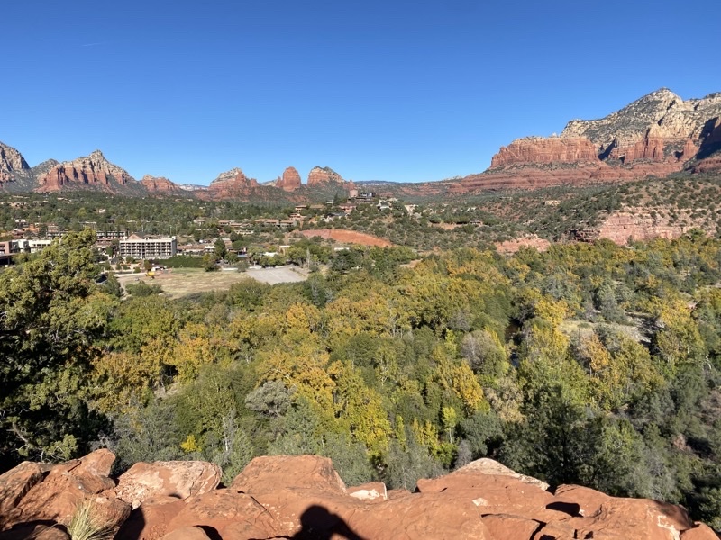 About 0.75 miles into our hike along the Huckaby Trail we found this bench with a view of part of Sedona. The trail has had some descents and ascents and the terrain has been rocky most of the way. That makes, certainly for me, the descents far more challenging.